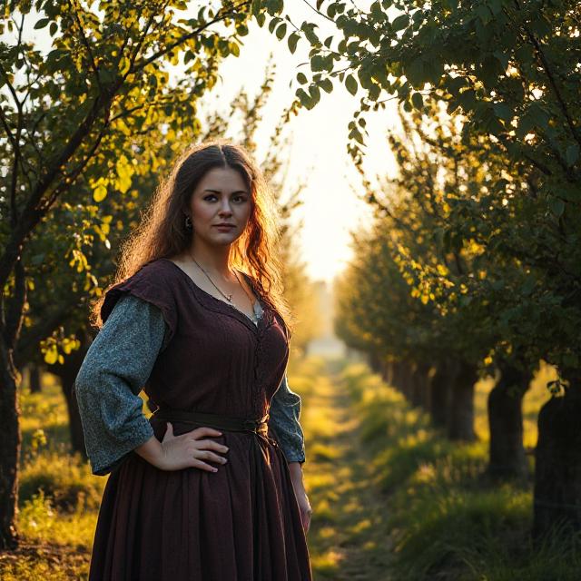 You rise and face your new destiny with resolve. Stepping into a modest kitchen-dining room, you find a single plate of dumplings waiting for you. You devour them ravenously, hunger overtaking all decorum. Then, you step outside into an orchard bathed in morning light. There stands your host—the sturdy woman you glimpsed in the final, drowsy moments of your journey.